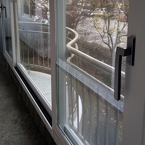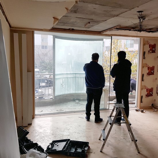 둥근모양의 곡유리 베란다를 일자 베란다 샷시로 교체시공