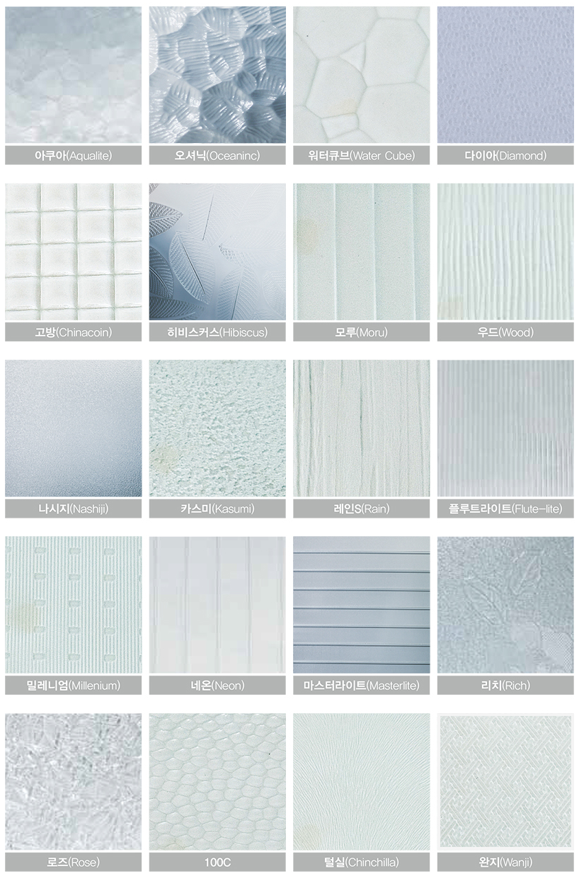 부드러운 느낌으로 아늑한 분위기를 만드는 무늬유리는 롤-아웃(Roll-Out)공법으로 제조된 유리로 한쪽 면에 아름답고 우아한 무늬가 새겨진 반투명 유리입니다. 다양한 무늬는 직사광선을 적절하게 조절하여 아늑한 분위기를 연출하며 외부로부터의 시선을 차단하여 사생활을 보호하여 드립니다.